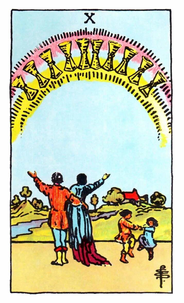 Десятка Чаш — это рай, за которым всё ещё тянется душа, потому что она чувствует: есть нечто большее, выше, ярче, чем то, что дано.