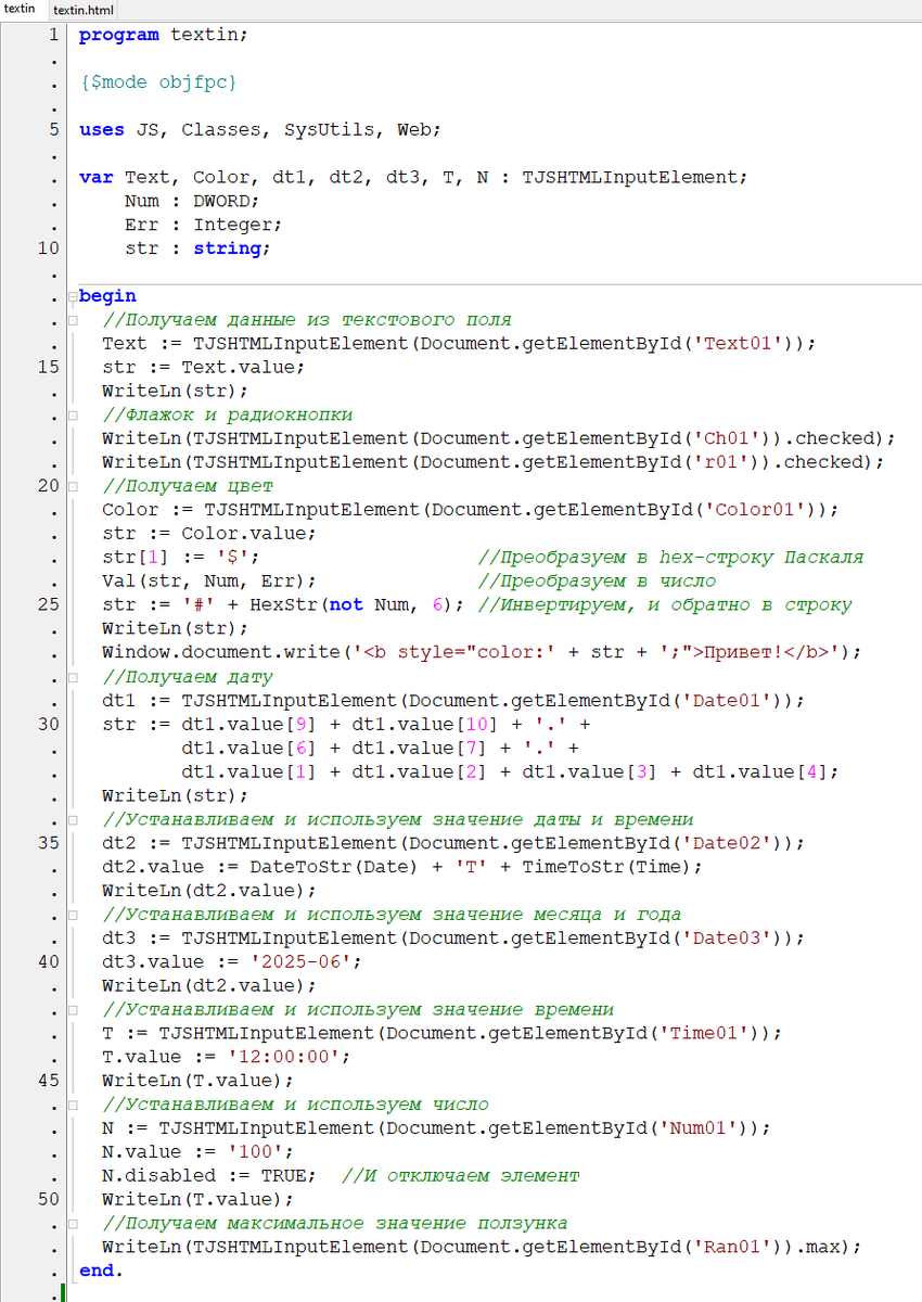 Ранее я рассказывал, как в Lazarus вывести данные в браузер. Вывод данных - это обычно первое, что делают при изучении нового языка программирования и/или среды разработки. Ну а второй шаг - это ввод данных (получение данных от пользователя). Сегодня этим и займёмся. Элементы на HTML-странице будут примерно теми же, что и при выводе данных, поэтому HTML-код не привожу. Ну а вот код в Lazarus покажу, хотя его и будет довольно много: Как и в случае с выводом данных, нам надо сначала найти на странице нужный нам HTML-элемент. При необходимости можно связать с ним переменную (если элемент будет использоваться более одного раза, то проще будет работать с переменной, чтобы не искать каждый раз нужный элемент). Ну а дальше, как нетрудно догадаться, мы используем свойство value, которое есть почти у каждого объекта, связанного с HTML-элементом. В это свойство мы записываем нужное нам значение, и таким образом отображаем в браузере какие-то данные. При этом помним, что все значения у нас являют