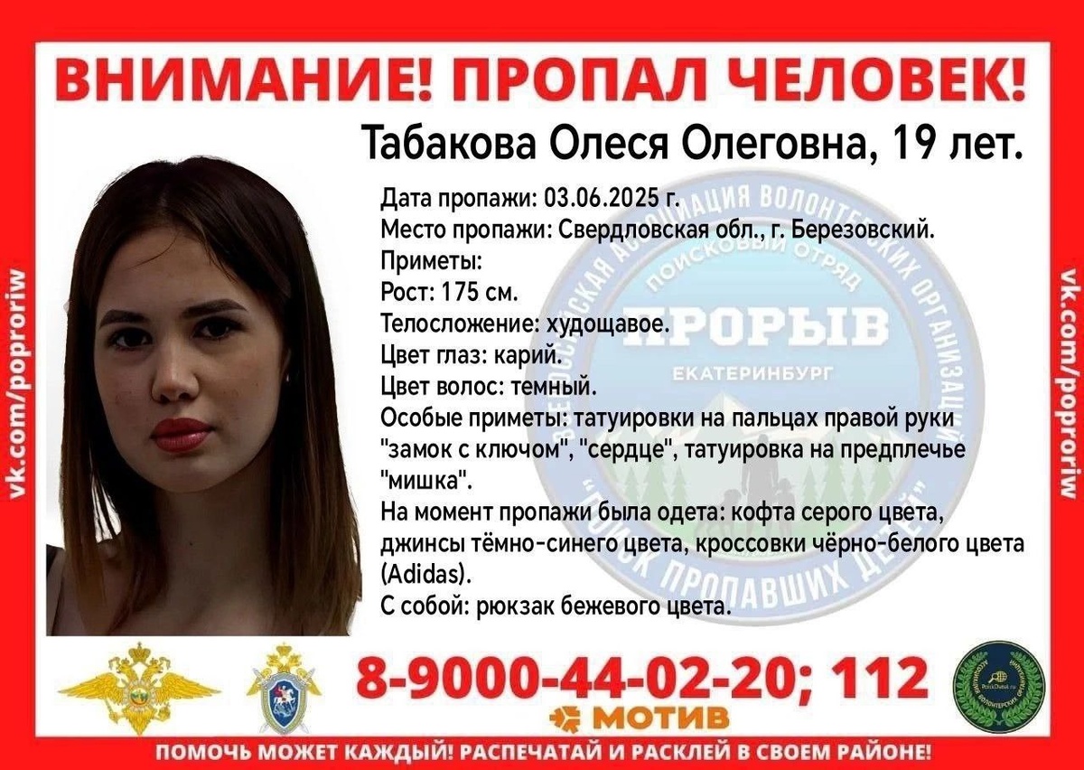 Пропала 19-летняя Олеся Табакова в Берёзовском В Берёзовском, Свердловская область, пропала 19-летняя девушка. Последний сигнал её телефона был зафиксирован в районе Шишкино. Что известно? 🕵️♂️ Поиском занимаются силовики и волонтёры. 📍 Последний сигнал телефона был в районе Шишкино. 🙏 Нужна помощь неравнодушных: волонтёры требуются как пешком, так и на машинах. 📞 Если вы видели Олесю, звоните по телефонам. Координаторы отряда «Прорыв»: Наталья, 89000440220 и Николай, 89120379790. 👉 Подробности ПОДПИСАТЬСЯ 🔔 | Прислать новость @Odry77 #поиск #пропажа #волонтёры #Берёзовский