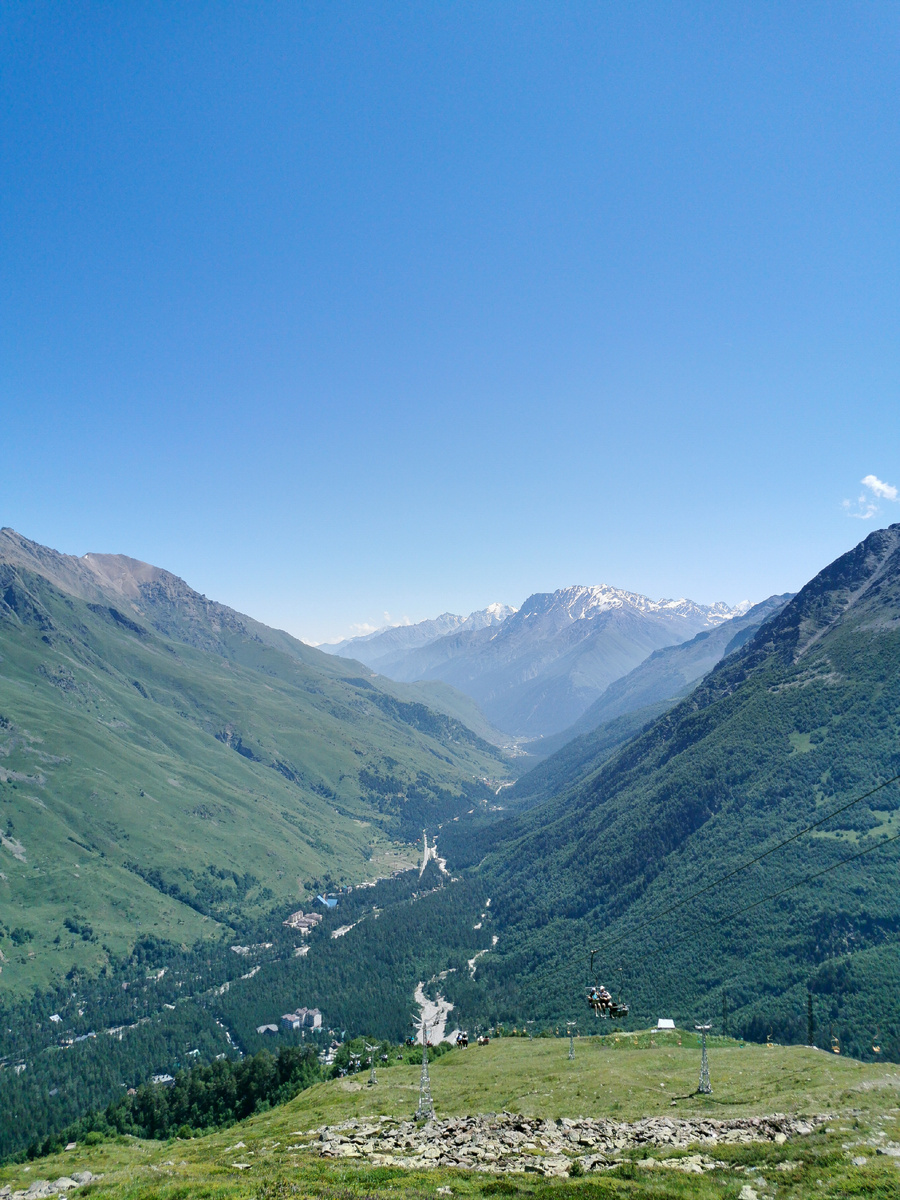 Этот простой, с небольшими спусками и подъемами, маршрут начинается в селе Терскол на станции канатной дороги "Поляна Чегет" (2100 метров над уровнем моря). Чтобы его еще больше упростить, мы с детьми проехали одну остановку вверх.