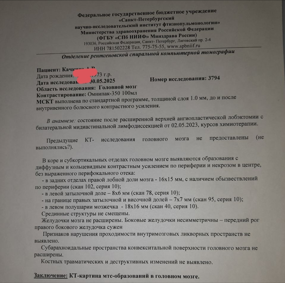 К сожалению, так бывает, что на себя уже и не надеешься. Этот текст не про меня. А про одного хорошего человека, которого мои подписчики давно знают. Что мы имеем, пишу уже по просьбе Анны. Анна - диагноз рак легких, операция, таргет - на днях выявлено прогрессирование в мозг. 4 метастаза в голове, один в мозжечке. Кости под вопросом, есть два места под подозрением на метастазы, сказали наблюдать. Срочный платный прием в Петрова, сейчас пытается попасть к радиологу для назначения гамма ножа и ищет, есть ли вообще квоты. Только что звонила, завтра платно прием в Напалкова у радилога. В Гранова не работает гамма-нож. Завтра и в Петрова химиотерапевт. Нужно и важно оставить в лечении наш таргет, а в Уфе его сразу отменят. Лечение возможно только в Санкт-Петербурге, живут в Уфе, где уже один раз врачи поставили крест, разрезали во время операции и обратно зашили. В Петрова прооперировали потом, но была уже операция с огромным разрезом и ювелирными вещами, которые врачам в Уфе не изв