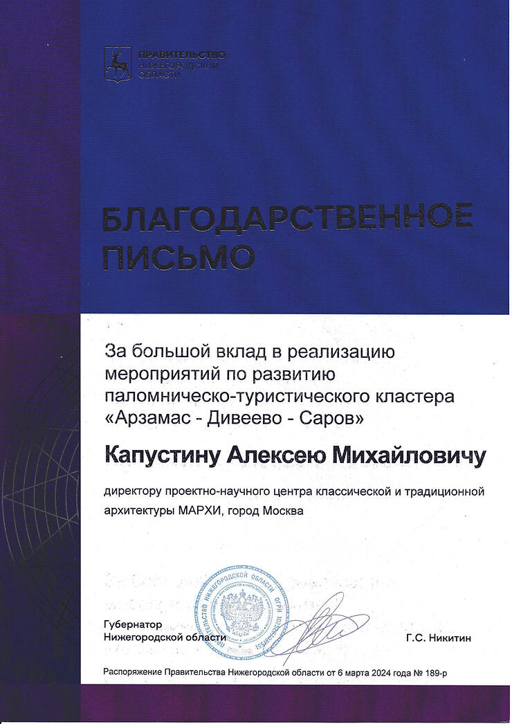 Благодарственное письмо от Губернатора Нижегородской области получил Директор Центра классической и традиционной архитектуры МАРХИ Капустин Алексей Михайлович за большой вклад в реализацию мероприятий по развитию паломническо-туристического кластера "Арзамас-Дивеево-Саров".