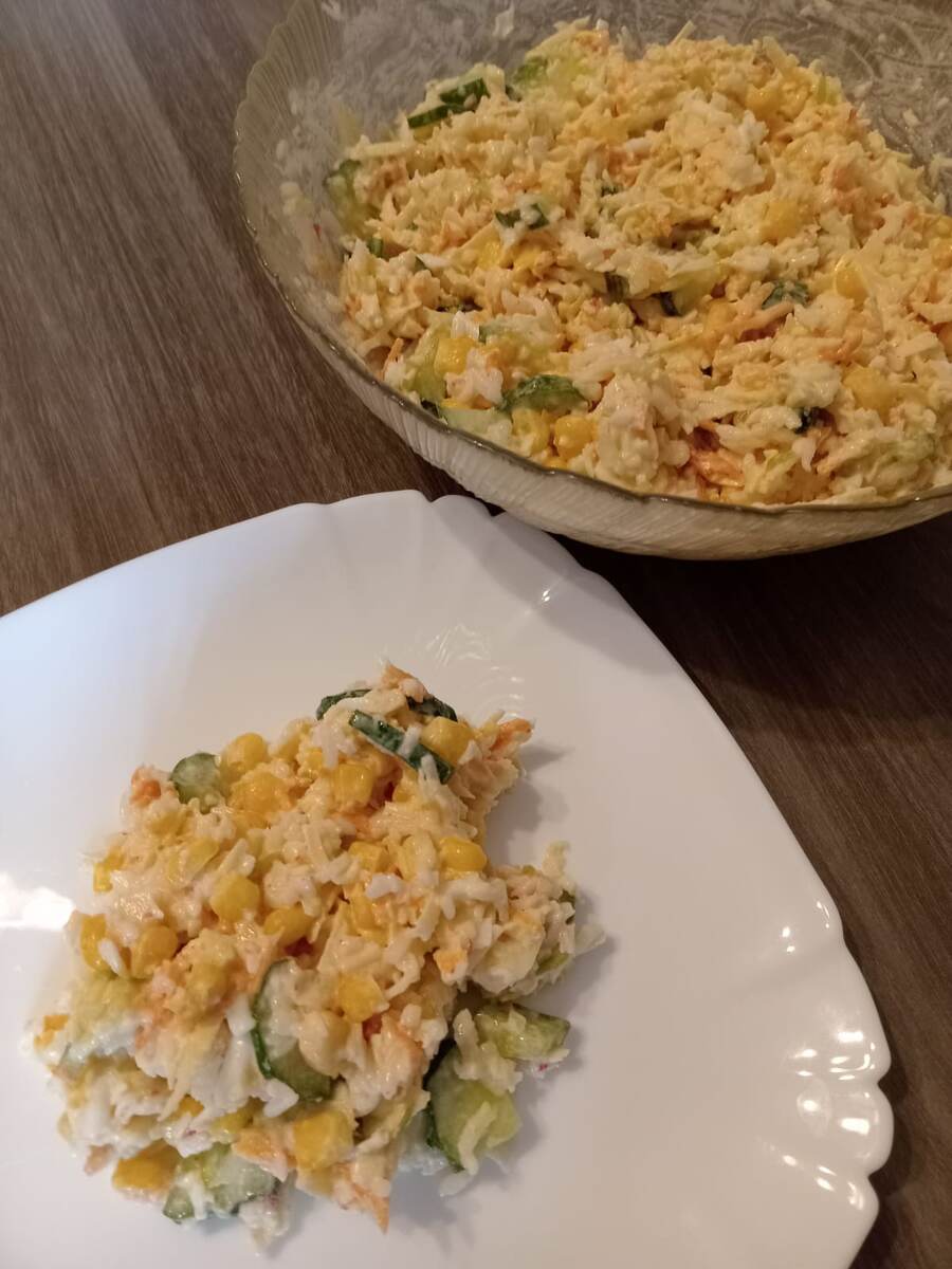 Чтобы ни говорили про крабовые палочки, а именно сурими, блюда с ними получаются вкусными и красочными. Один из таких вариантов крабовый салат с освежающей ноткой из всем знакомого нам фрукта - яблока. Для готовки используем следующие ингредиенты (на 5-6 персон:): 1) Выкладываем в салатник отварной промытый рис. 2) На средней тёрке измельчаем крабовые палочки. 3) Измельчаем и добавляем лук. 4) Пропускаем через мелкую тёрку очищенную морковь. 5) Нарезаем небольшими дольками вымытые огурцы. 6) Пропускаем через среднюю тёрку очищенные отварные яйца. 7) Добавляем консервированную кукурузу. 8) Пропускаем через мелкую тёрку сыр. 9) И главный ингредиент - зелёное кисло-сладкое яблоко. Пропускаем его через среднюю тёрку. 10) По желанию подсаливаем (необязательно). Добавляем майонез и хорошенько перемешиваем. 11) Оставляем в холодильнике на 2 часа или более для охлаждения. Затем подаём в салатнике и порционно. Вкусный и сытный салат с интересными нотками готов. Он разнообразит повседневный