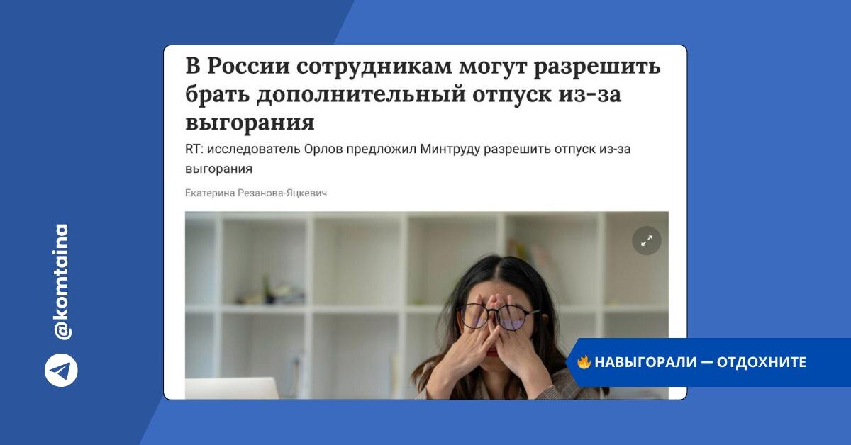 🔥 Навыгорали — отдохните. В России предлагают ввести официальный отпуск из-за выгорания Не шутка. В стране обсуждается реальная инициатива: ввести оплачиваемый отпуск по причине профессионального выгорания. ✅ Предложение уже направлено в Минтруд. ✅ Основание — признание выгорания заболеванием на уровне ВОЗ. ✅ Аргументация — массовое истощение на работе у специалистов, которые просто "перегорают". Кто в зоне риска в первую очередь? — Врачи, — соцработники, — сотрудники IT-индустрии. Те, у кого нервная система под нагрузкой 24/7 и нет «права на усталость». 📌 Если инициатива пройдёт, в ТК РФ может появиться новое основание для краткосрочного отпуска, оформленного официально, без дураков и объяснений «почему вы не выдержали». 💬 Как говорится — навыгорали на отпуск. И если это реально примут, это будет первая системная мера в России по борьбе с выгоранием на уровне закона, а не мемов. 🔥 - меня добавьте в список. @komtaina