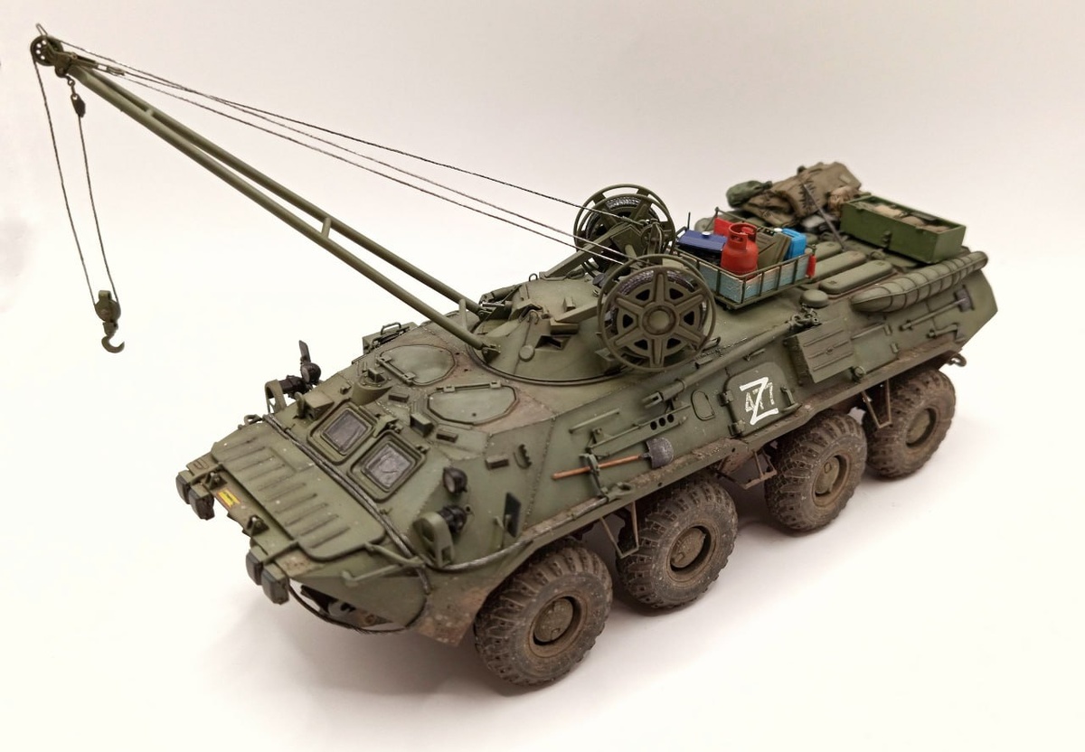 БРЭМ-К (БТР-80) Uve Trumpeter, 1:35 От автора: "Хочу представить на ваш суд модель, которую давно хотел заиметь в свою коллекцию, а благодаря конкурсу воплотил мечту в реальность. Я люблю инженерную технику, поэтому выбрал для себя эту категорию. Модель – БРЭМ-К на базе БТР-80 (Трумпитер). В работе также использовал конверсионный набор от Kraft Lab, от него же колеса, а также ни много ни мало – рабочую подвеску от Э.В.М. Кроме озвученных допов использовались также мелкие элементы типа канистр, деталей двигателей, инструмента и багажа разных производителем, из пластика и печати. Подвеска, на мой взгляд, была самым сложным моментом, так как я с такой сложной конверсией еще не сталкивался. Однозначно могу рекомендовать ее к приобретению, но только опытным моделистам. Для окраски модели использовал ряд красок отечественных и импортных производителей (в основном JimScale, AmmoMIG и Акан). Опираясь на имеющиеся фотографии этой машины в сети, а также вследствие наличия большого количест