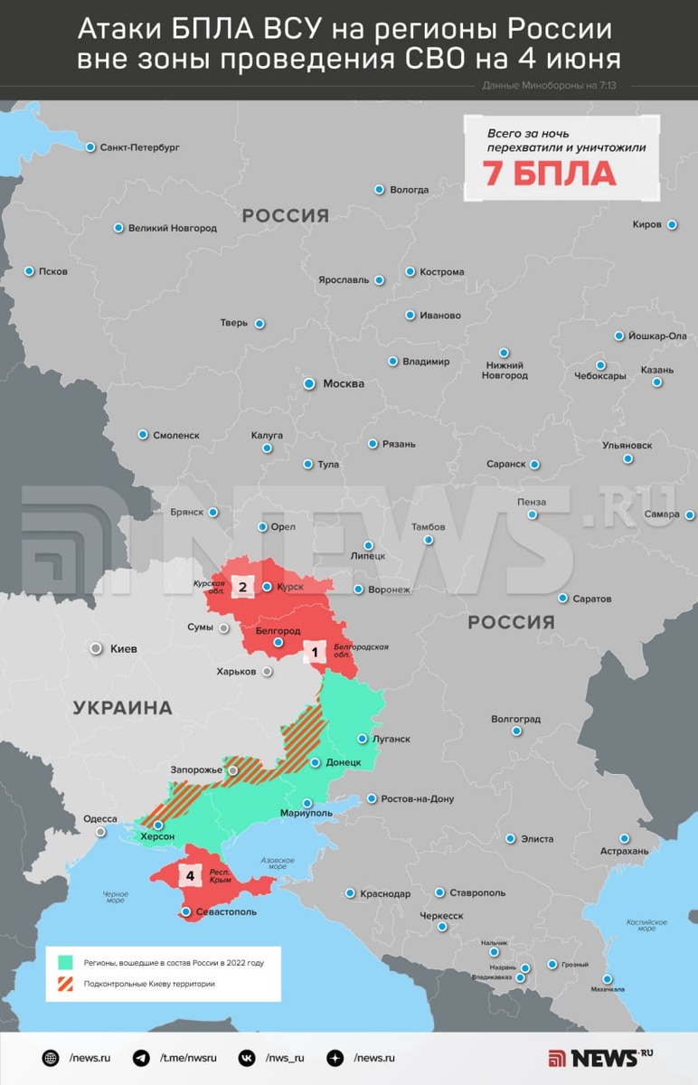Российская ПВО уничтожила семь украинских дронов за ночь, сообщили в Минобороны РФ. Четыре БПЛА были сбиты над Крымом, два — над Курской областью, еще один — над Белгородской. ⭕ Подписаться | Прислать новость | Буст