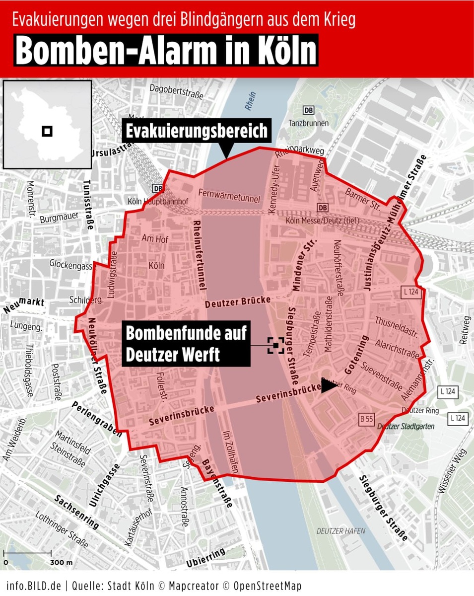 В Кельне эвакуируют 20 тысяч человек из-за бомб времен Второй мировой войны. Как сообщает Bild, эвакуация пройдет в среду перед началом обезвреживания трех американских бомб. Под отселение попали жители и сотрудники предприятий в районах Альтштадт и Дойц, а также гости отелей — всего примерно 20,5 тысяч человек. В зону эвакуации вошли здание телерадиокомпании RTL, вокзал, ратуша, больница, два дома престарелых, школы и детсады. Из-за операции временно перекроют три моста через Рейн. Кельнский собор в зону эвакуации не попал.