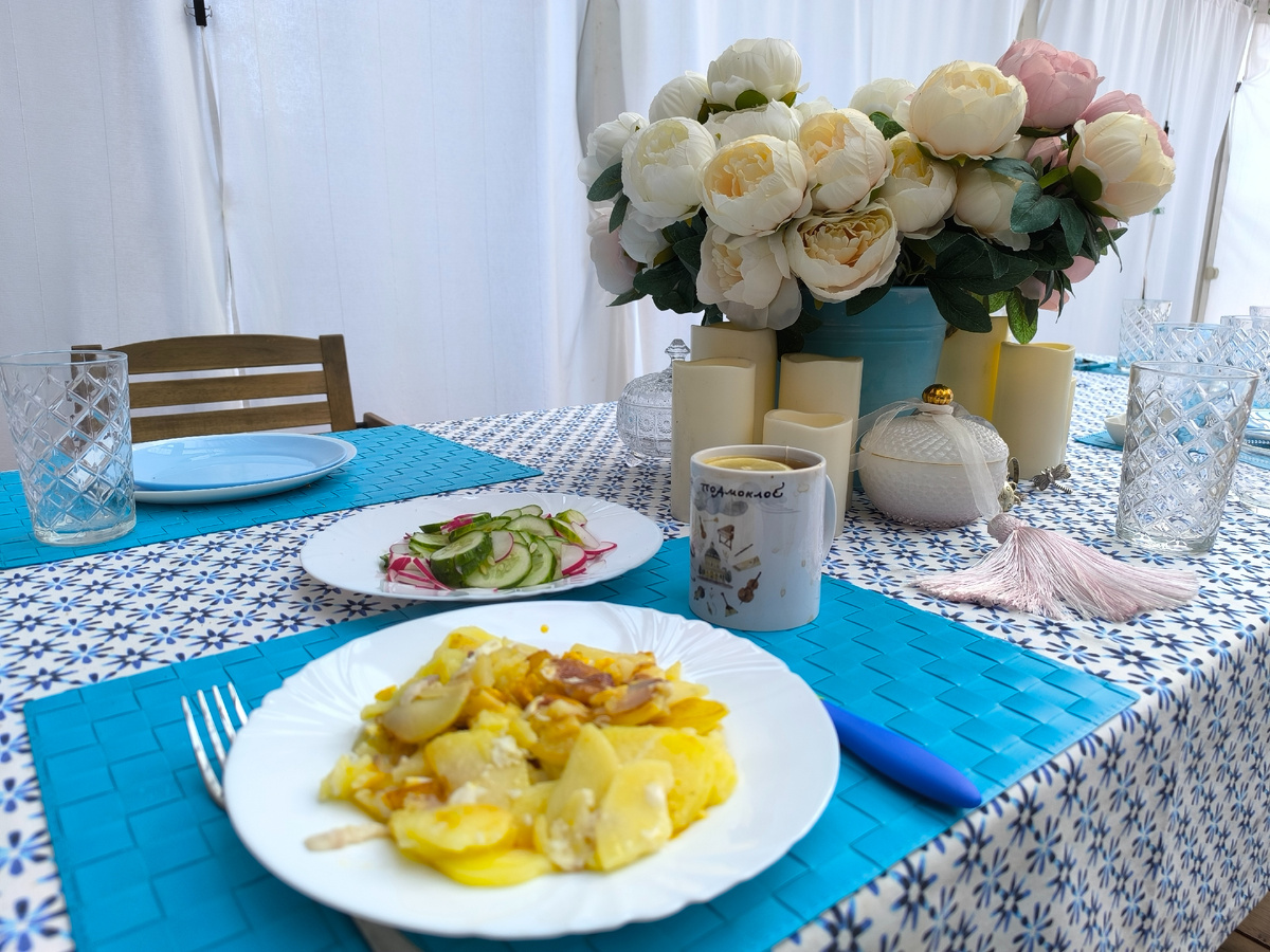 К вечеру умоталась так, что просто поджарила картошечки и порезала редиски с огурцом. Из напитков чай с лимоном горячий. Сала немного порезала. И мне было так вкусно!