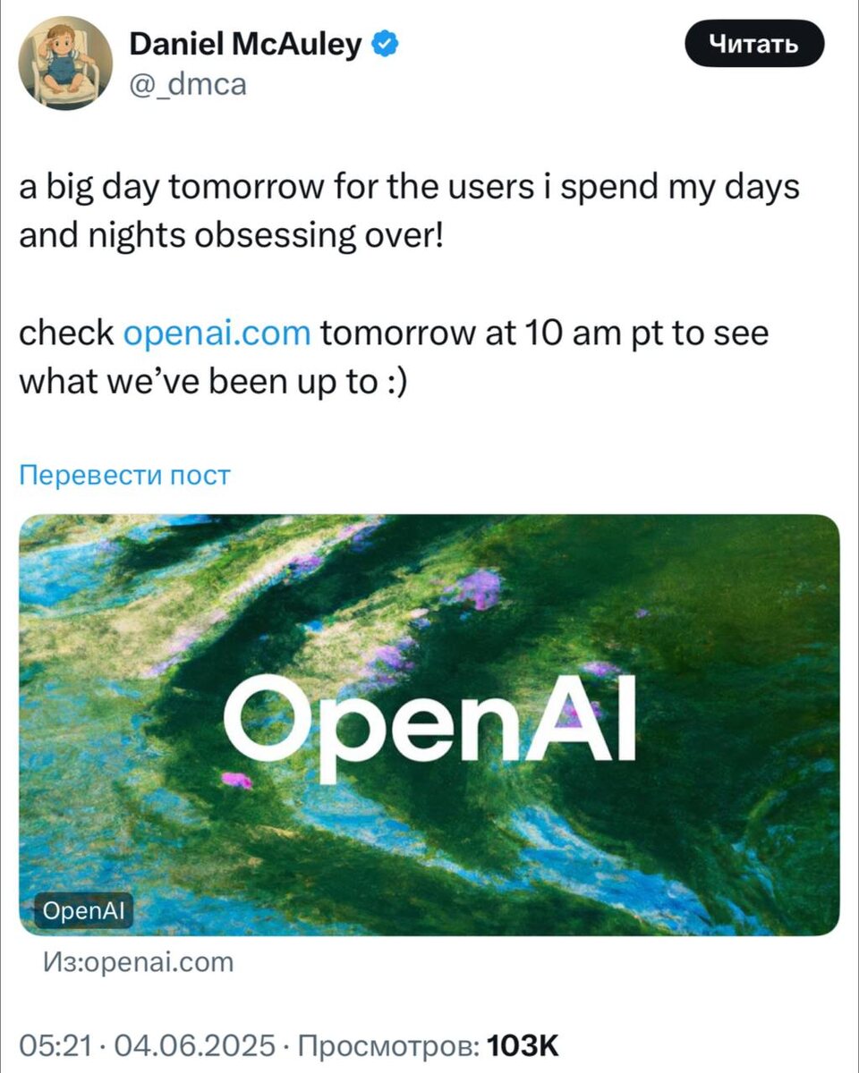 ⚡️ Сегодня в 20:00 по МСК — что-то новенькое от OpenAI Об этом намекнул инженер стартапа, который написал: «Будет большой день для пользователей, о котором я думаю днями и ночами». 👀 Что именно покажут — пока секрет. Но если даже технари не спят ночами, значит, ждать есть чего. Включаем напоминание на 20:00. — 🧠 Подпишись, чтобы не пропускать важные анонсы в мире ИИ и технологий: 👉 Нейробухта