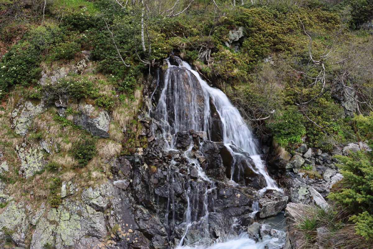 Дошли мы до водопада, который с противоположной стороны нам был не виден, а сейчас открыт во всей красе! Зато вид на каньон с этой стороны совершенно закрыт! Так, что обязательно надо пройти со всех сторон реки, если идти с какой-то одной, то можно чего-то и не увидеть, как например мощные перекаты реки чуть выше от водопада! Сколько бы мы не лазили, нигде не нашли нормального вида на каньон... Зато в самом конце каньона открывался шикарнейший вид в обе стороны! Пройдя каньон, мы вышли еще в одну красивейшую долину, с водопадами и альпийскими лугами. Я почему-то была уверена, что отсюда, из этой долины, будет прекрасно виден Марухский ледник, так как он виден с Черного озера – но нет, совсем не увидели. Конечно, тут бы еще ходить и ходить, но нам пора возвращаться к машине… На обратном пути, с моста, виден еще один каньон, он, конечно, поменьше, чем тот, что был в Медвежьей пасти, но тоже очень красивый))) Кстати, обратно ехали почти постоянно по воде, сначала думали, что дождь прош
