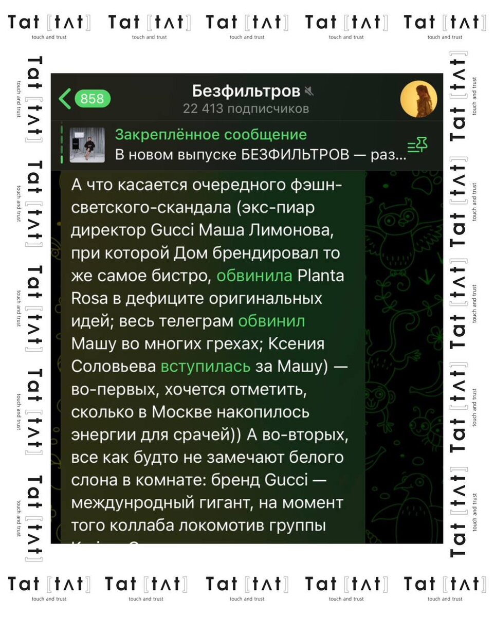 Оказывается, кое-какие скандалы имели место быть в связи с запуском коллаборации Planta Rosa x Margarita Bistro: обвинили в воровстве идеи у GUCCI. Подробно все объяснила на своем канале Настя Полетава, согласны с каждым ее пойнтом.