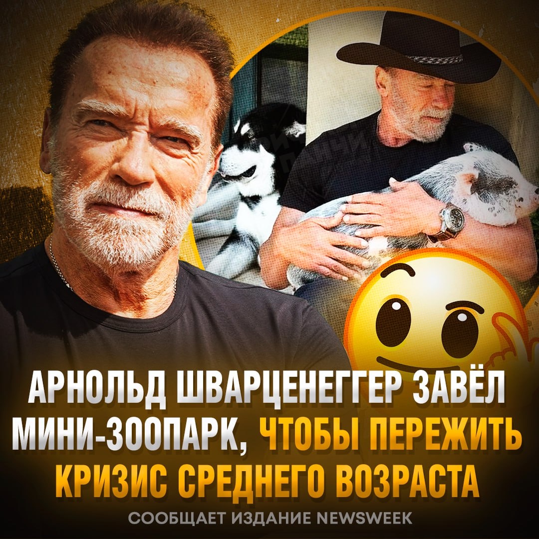 Сын Шварценеггера рассказал, что его отец переживает «кризис среднего возраста» в 77 лет 😁 Шварценеггер окружил себя необычными домашними животными — мини-лошадью, свиньёй, ослом, собаками и другими