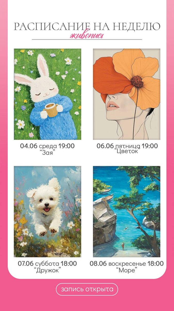✨Расписание по живописи на неделю . ✨Мастер-классы для взрослых и детей . ‼️Можно выбрать любой сюжет ! Рисунок на выбор ! 📞 +7 (992) 331-83-51 ЛС @ArtAkadem66 🪙 холст на подрамнике 25*20 см -850 руб., 30*40 -1500 руб., 40*50 -1900руб. , 🪙холст на картоне 30*40 или 30*30 см -1200 руб., 20*30см-850 руб, 🪙футболка (наша овер,) -1500 руб. 🪙сумка/шоппер/рюкзак из плотной холщи-1200 руб. 📍 АртАкадем, Академика Ландау 45, 1 подъезд, 1 этаж , домофон 8 Записывайтесь прямо сейчас — количество мест ограничено! 📞 +7 (992) 331-83-51 ЛС @ArtAkadem66 📍