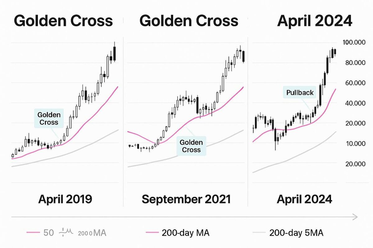 Если вы думаете, что “golden cross” = ракета на следующий день — увы, рынок так не работает. Но вот что интересно: в 3 последних случаях паттерн был почти одинаковым.