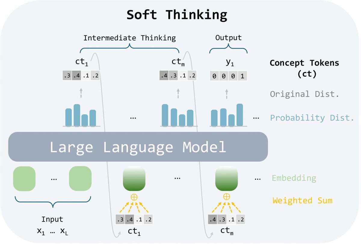 с моим коллегой произошла типичная история кражи идеи из головы: вышла работа, где предлагается концепция soft thinking (первая картинка); простыми словами это про то, что рассуждения в виде слов ограничивают выразительную способность модели (думаю, что и человека тоже), если это ограничение снять (вторая картинка), то результата можно достичь быстрее (третья картинка)