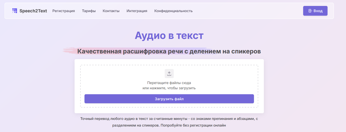 Тут все максимально просто — загрузил файл, получил текст. Никаких заморочек с регистрацией или настройками. Подходит для быстрой расшифровки лекций, интервью или деловых встреч.
