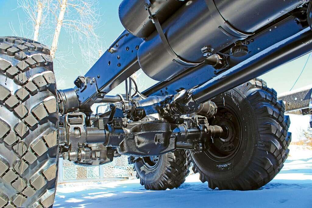 На КАМАЗах средний (проходной) мост всегда оборудован межосевым дифференциалом, не допускающим пробуксовку шин при отклонении от прямолинейного движения. Зато «ураловские» мосты – все, включая передний – сконструированы с горизонтальными разъемами редукторов, что позволило максимально высоко расположить карданные валы, практически исключив их повреждение на пересеченной местности.