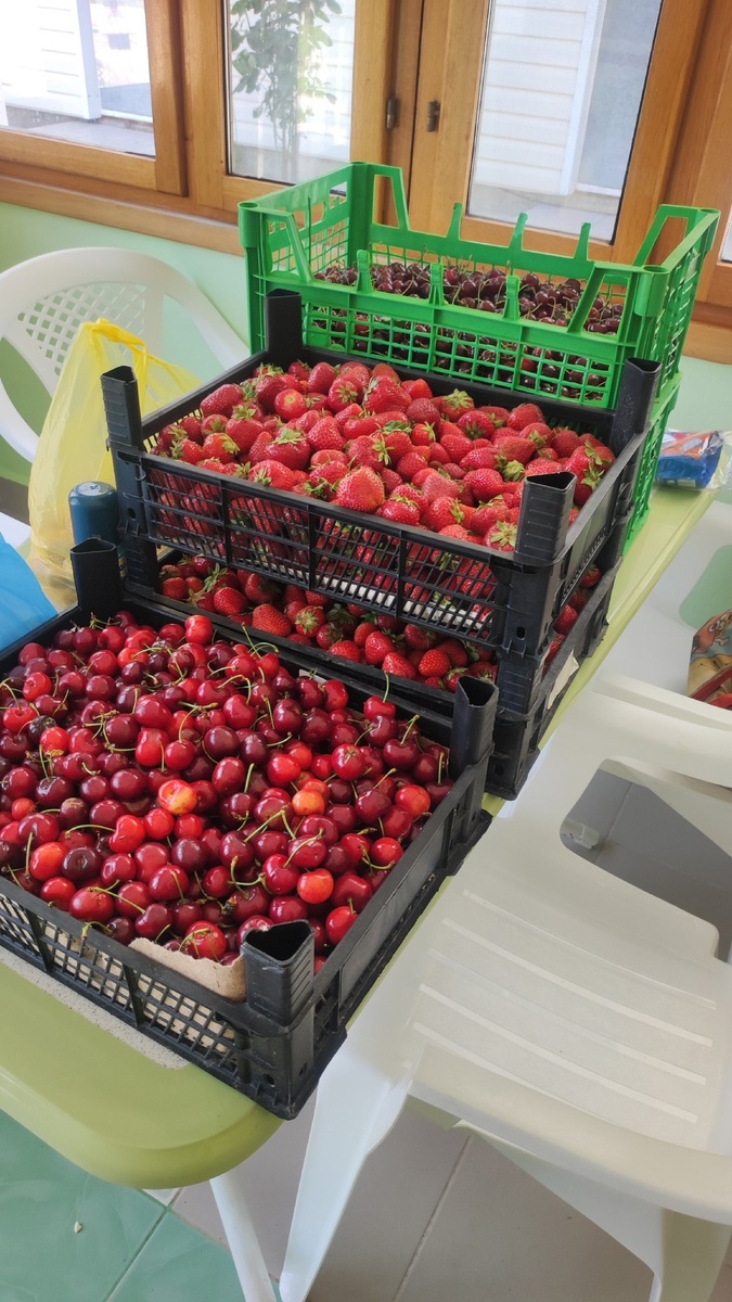 Клубника подешевела. Если брать ящиком, то 200р за килограмм. Розницей - 250р. Черешни уже много - 500р килограмм. Горох 300-350р.