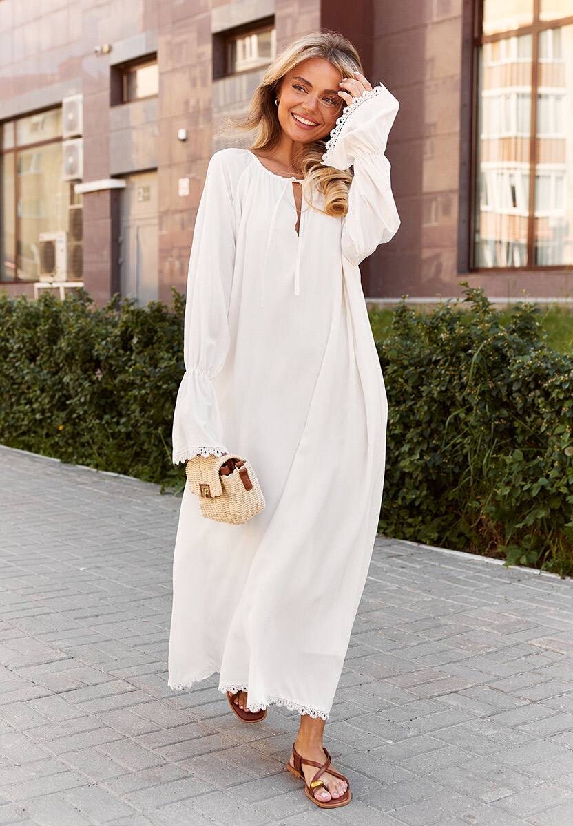 Cruise — это когда не надо лишнего. Свободный крой, плавные линии, широкие рукава на резинке — оно будто создано для того, чтобы жить в нем лето🤍 Мягкая сборка по горловине добавляет воздушности, гипюровая отделка на рукавах и подоле — фактуры, а съёмный пояс позволяет менять настроение образа: носить распущенным или подчеркнуть талию. На подкладке из той же ткани — чтобы нигде не просвечивало и было комфортно в любую погоду👌🏻 Не требует сложной стилизации: пара кожаных сандалий или простые босоножки, немного загара — и можно выдыхать. Cruise уже на сайте. И ждёт тех, кто умеет отдыхать красиво💕