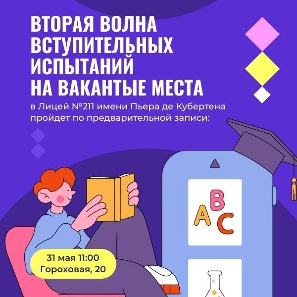 31 мая пройдет вторая волна вступительных испытаний в лицей 211. Набирают учеников в 2-10 классы. Лицей активно рекомендует 239 ПФМЛ тем, кому не хватило баллов в их учебное заведение. Подробнее: https://vk.com/wall-198583821_6214