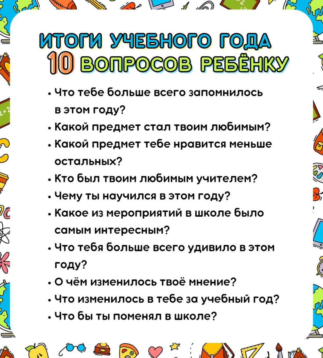 А вообще, это разговор о том, что было трудно, что запомнилось, что получилось. И кем стал он, ваш ребёнок, за эти девять месяцев школы. Вопросы, которые можно задать ребёнку в конце учебного года (в картинке наверху ⬆️), но я бы добавила еще: 💬 Было ли что-то, что тебя пугало, но ты справился?