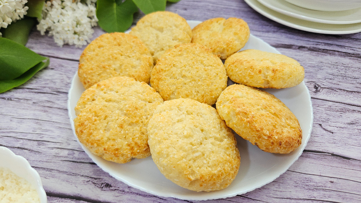 Мягкое, ароматное и очень вкусное печенье с кокосовой стружкой и творогом к чаю. Выход: 8 штук Вес: 250 гр КБЖУ на 100 гр: 257,86/18,01/10,34/22,45 КБЖУ в 1 шт: 80/5,58/3,21/6,96 Подсластитель - 1 грамм моего подсластителя пребиосвит фитнес = 10 гр сахара В миску поместить творог, яйцо и подсластитель. Тщательно растереть вилочкой, если творог крупинками, то лучше пробить погружным блендером. Добавить кокосовую стружку, разрыхлитель и постепенно всыпать муку. Муки может потребоваться больше или меньше, зависит от влажности творога. Замесить тесто. Оно должно получиться мягким, пластичным, слегка липнущим к рукам. Разделить тесто на 8 равных частей. Скатать шарики. Противень застелить пергаментом с силиконовым покрытием. Выложить шарики теста. Слегка приплюснуть руками. Выпекать в заранее разогретой до 160 гр духовке (у меня электрическая) в режиме верх-низ примерно 25 минут до румяности. Дать печенью остыть.
