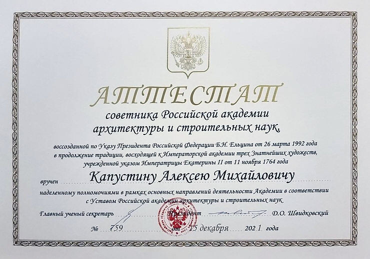 В соответствии с указом президента РААСН Швидковского Д.О., директор Центра классической и традиционной архитектуры МАРХИ Капустин А.М. назначен советником Российской академии архитектуры и строительных наук.
