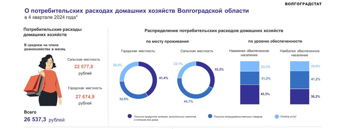В среднем 26 537,3 рублей тратит один житель Волгоградской области в месяц. Об этом свидетельствует статистика Росстата. Каждый житель сельской местности тратит поменьше: по 22 577 рублей в месяц, подороже обходится жизнь в городе: по 27 674 рубля на человека. Большая часть средств (45,5%) у менее обеспеченных волгоградцев уходит на покупку продуктов, алкоголя, а также кафе, рестораны и столовые. Это примерно 11 700 рублей. Те, кто побогаче, расходуют на эти цели 36,2% от ежемесячной суммы. Также в приоритете покупка непродовольственных товаров и оплата услуг, которые ежемесячно «съедают» около 6 тысяч рублей. Что касается питания, то львиная доля запланированных на него средств (25,4%) расходуется на мясные продукты. Это около 3 тысяч рублей в месяц. На втором месте — молоко. Из непродовольственных товаров лидирующие позиции занимают одежда, обувь, белье и ткани (25,2%), а также транспортные средства, аксессуары и ГСМ (19%). На отдых и культурные развлечения уходит только 7,3% от обще