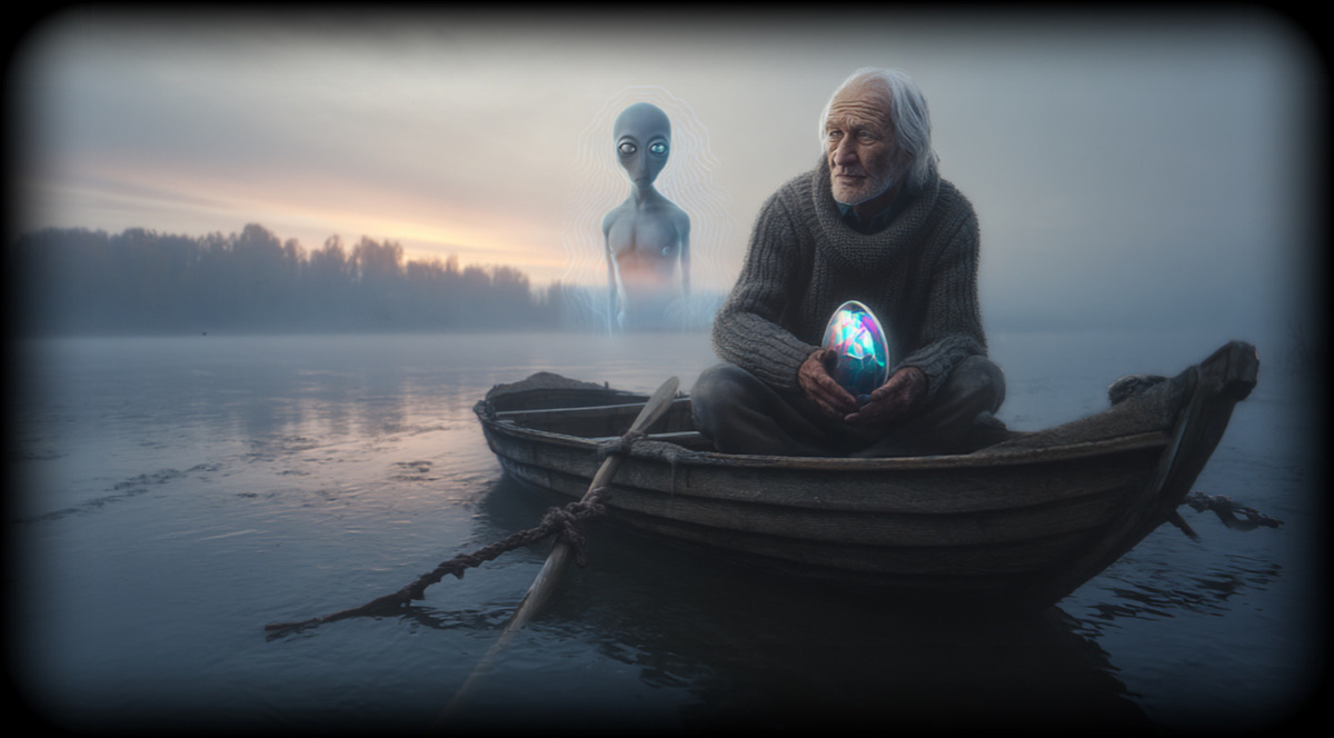 Как только он коснулся кристалла, лодку наполнило мягкое, голубоватое сияние. Перед стариком, прямо над кристаллом, возникло изображение. Нечеткое сначала, оно быстро сфокусировалось, явив фигуру существа. Высокое, тонкое, с большими темными глазами на вытянутом лице. Кожа его была пепельно-серой, а одеяние, если это можно было так назвать, струилось и мерцало, как сама поверхность кристалла. Существо не двигалось, но Кузьмич чувствовал, что оно смотрит прямо на него.