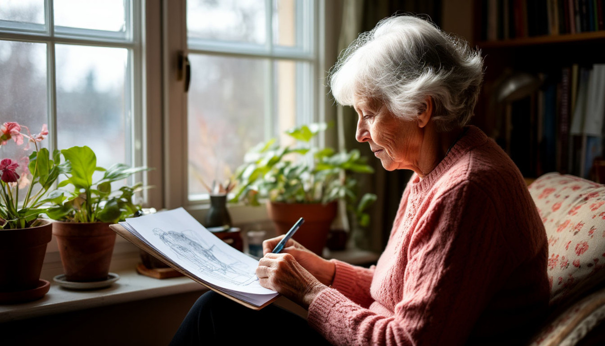 Перед окном, освещённым мягким, вечерним светом, сидела Софья Аркадьевна. Не просто сидела — творила. Перед ней стоял небольшой мольберт, к которому был аккуратно прикреплён чистый лист бумаги. На столике — настоящее разноцветное богатство: тюбики с акварелью, пара кисточек, стакан воды. Софья Аркадьевна держала кисть в руке легко, будто родилась с нею. Лицо её было спокойным и собранным, в каждом жесте чувствовалась уверенность.