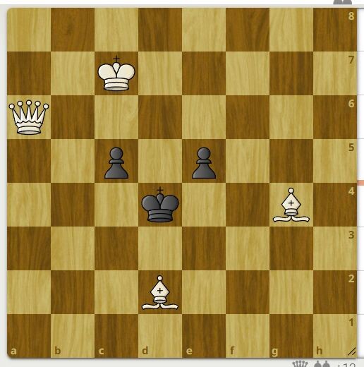 Автор задачи Э. Лаздиньш, 1958 год. Черный король "держит за руки" две свои пешки. У белых два слона и ферзь. Белые начинают и ставят мат в 2 хода. Более сильная задача тут >>>>> Первый верный ход смотрите в галерее.