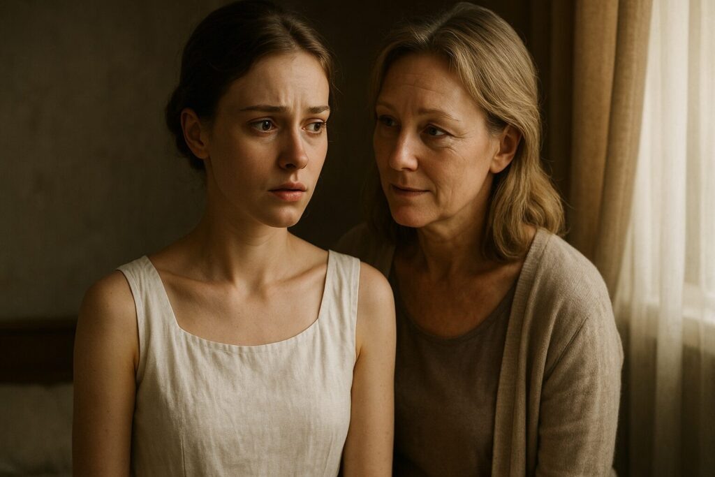 Марина присела рядом на диван, осторожно, чтобы не помять платье дочери — простое, элегантное, совсем не похожее на то пышное, которое Олеся выбирала два года назад. Для другой свадьбы. Которая так и не состоялась.