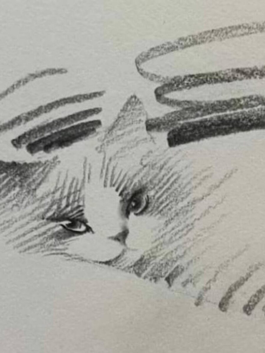 Пара штрихов и полный дзен. Шоу Синь — китайский художник из провинции Хэнань. Берёт в руки карандаш — и вместо эскиза вдруг появляется кот. Напоминает, как в детстве: монетку под лист — и штрихуешь по рельефу. Кажется, просто игра — а с котиками магия. Иногда думаешь, что чтобы создать что-то стоящее, нужно замучить себя сложностями. А потом оказывается — достаточно пары линий и тихого мяу.