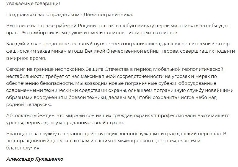 Для защиты Отечества пограничникам надо сосредоточиться на угрозах и мерах обеспечения безопасности, заявил Лукашенко, поздравляя личный состав и ветеранов органов пограничной службы с Днем пограничника @SPUTNIKBY