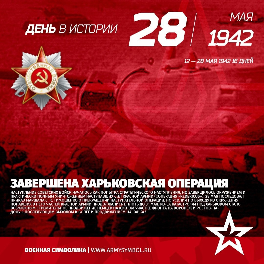Завершена Харьковская операция в 1942 Наступление советских войск началось как попытка стратегического наступления, но завершилось окружением и практически полным уничтожением наступавших сил Красной армии («операция Fredericus»). 28 мая последовал приказ маршала С. К. Тимошенко о прекращении наступательной операции, но усилия по выходу из окружения попавших в него частей Красной Армии продолжались вплоть до 31 мая. Из-за катастрофы под Харьковом стало возможным стремительное продвижение немцев на южном участке фронта на Воронеж и Ростов-на-Дону с последующим выходом к Волге и продвижением на Кавказ. #ПамятныеДатыВоеннойИсторииОтечества #ДеньВИстории #ГодЗащитникаОтечества #80ЛетВеликойПобеды Источник: https://vk.com/wall-60767131_30751 Подпишитесь на наши группы ВКонтакте и в Одноклассниках - читайте, смотрите и комментируйте! Источник