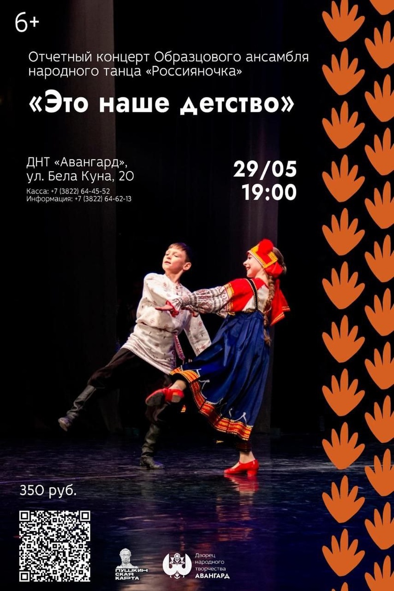 Выступаем и всех приглашаем! Концерт «Это наше детство»: радость и теплота во Дворце народного творчества «Авангард»! 29 мая в 19:00 Традиционный концерт, в котором Образцовый ансамбль народного танца «Россияночка» соберет на одной сцене творческих коллег – хореографические коллективы Томска. В программе примут участие: 📍Образцовая студия современной хореографии «Экзерсис» (рук. Е. Губанова); 📍Образцовая хореографическая школа – студия «Овация» (рук. Т. Коровина); 📍Детский хореографический коллектив «Гравитанцы» (рук. Ю. Худых); 📍Народный ансамбль горского танца «Даймохк» (рук. Р. Ахмадов); 📍Образцовая хореографическая школа – студия «Фуэте» (рук. И. Саввиди); 📍Театр танца ТГПУ (рук. Л. Тимошенко). 💃🏻Зрителей ждет погружение в яркий мир детства, представленный в художественных образах народного и современного танцев! Билеты по ссылке: clck.ru/3LutZ4 (350 руб.) Действует Пушкинская карта👍