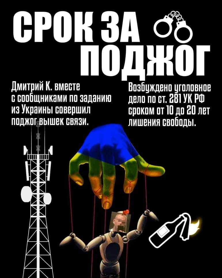 ⚠️ Что бывает за поджог? Тюрьма! Ситуация: кто-то (украинские спецслужбы) связывается через мессенджер с ребёнком и предлагает ему «подзаработать». Итог: подросток соглашается, совершает поджог и за это получает тюремный срок. Жизнь сломана навсегда. Ваша свобода и будущее — это самое главное! Думайте о последствиях и будьте бдительны!