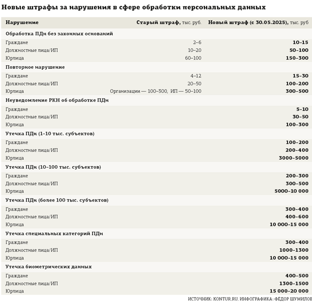 Ещё более суровое наказание грозит за утечки собранных персональных данных. В случае такого инцидента компания или предприниматель должны в течение 24 часов уведомить РКН, сообщив о причинах, масштабах и принятых мерах. Затем, в течение 72 часов, передаются итоги внутренней проверки, включая информацию о возможных виновных лицах (при их наличии). Несоблюдение этих норм может грозить штрафом до 3 млн рублей.