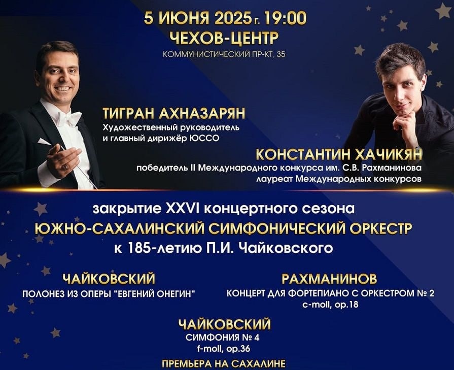 XXVI концертный сезон Южно-Сахалинского симфонического оркестра – всё 🎵 Серия выступлений завершится большим симфоническим концертом, приуроченным к 185-летию рождения великого русского композитора П. И. Чайковского. Солист концерта – лауреат многих международных конкурсов, победитель II Международного конкурса имени Сергея Рахманинова Константин Хачикян. Во втором отделении концерта впервые на Сахалине прозвучит монументальная Симфония №4! 🎶 Ждём любителей классики 5 июня в 19:00 в Чехов-центре. Билеты доступны по ссылке. @USKO2022