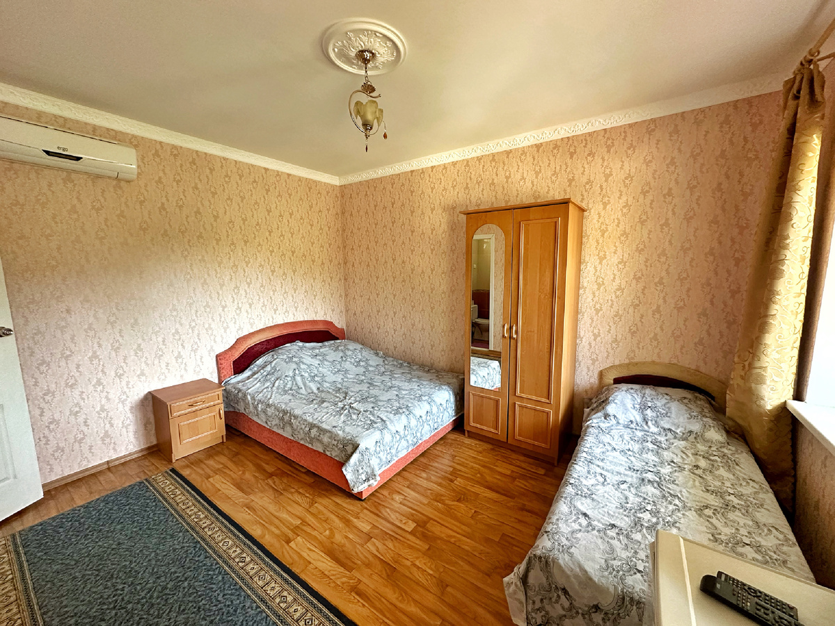 От этого жилья у нас остались неоднозначные впечатления. Я забронировала жилье за две недели до заезда, однако, по прибытии оказалось, что номер был подготовлен лишь частично. После бронирования жилья через агрегатор со мной никто не связался и не поинтересовался к какому времени нас ждать (обычно все владельцы жилья спрашивают). Когда мы приехали по адресу гостевого дома, я зашла во двор и там никого не оказалось. Пришлось звонить хозяину, он перезвонил родителям и только тогда нас встретили. Я бронировала трехместный номер с одной двухспальной кроватью (для нас с дочкой) и одной односпальной (для мужа). В номере есть небольшой холодильник, кондиционер, телевизор, шкаф, тумбочка. По фото кажется, что это двухспальная кровать, а на самом деле — диван. Из-за этого та часть, которая выдвигается пружинистая и с перепадом высот. Я приноровилась и укладывалась так, чтобы этот бугорок не ощущался. В целом, кровати нормальные. Кондиционер рабочий, но очень грязный. Это проблема многих отелей