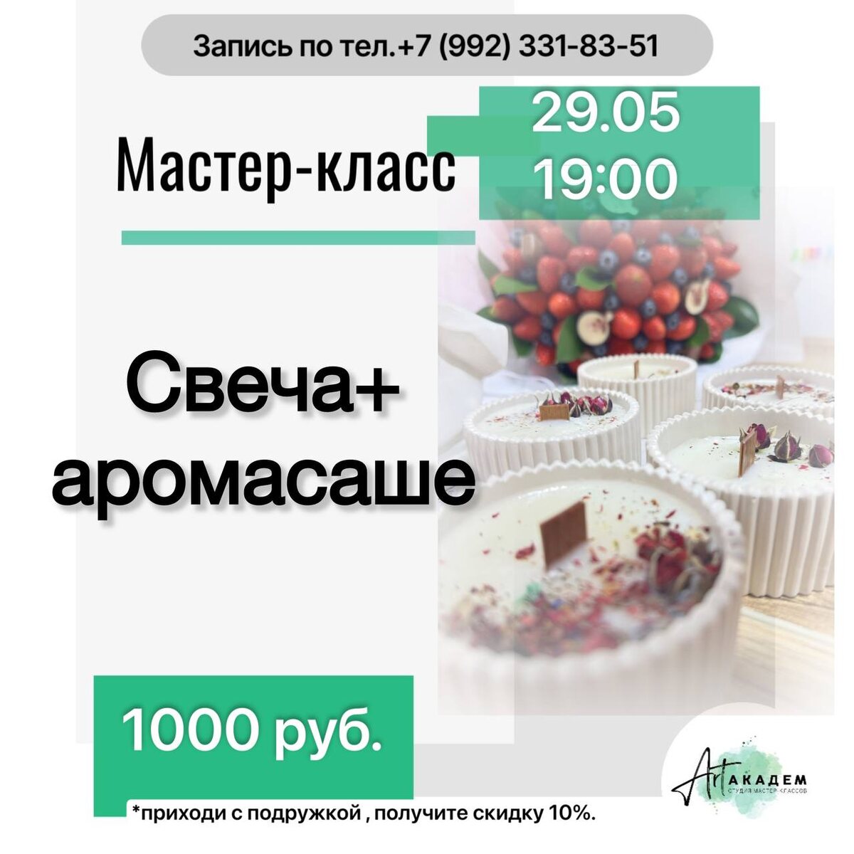 🌟 Приглашаем Вас на мастер-класс по изготовлению свечей из соевого воска премиум качества и аромасаше! 🌟 📅 Дата: 29 мая 🕛 Время: 19:00 🪙 Ценность: 1000 руб. 📍 Место: АртАкадем , Академика Ландау 45-8. 🕯️ На нашем мастер-классе Вы научитесь создавать ароматные свечи , которые не только украсят Ваш интерьер, но и подарят уют и гармонию в Вашем доме. 🕯️ Мы используем только качественные компоненты, что делает наши свечи безопасными и экологичными. 🕯️ Вы узнаете о процессе работы с соевым воском, о том, как правильно подбирать ароматы и красители, а также о техниках заливки и декорирования свечей. 🕯️ Каждый участник получит возможность создать собственные свечи и аромасаше, которые можно будет забрать с собой. Не упустите шанс погрузиться в мир творчества и ароматов! Количество мест ограничено, поэтому поспешите записаться. Подробности и запись: ✍️ лс @ArtAkadem66 ☎ +7 (992) 331-83-51 🌍 t.me/art_akadem66 🌍vk.com/art_akadem Ждем Вас на нашем мастер-классе, чтобы вмест