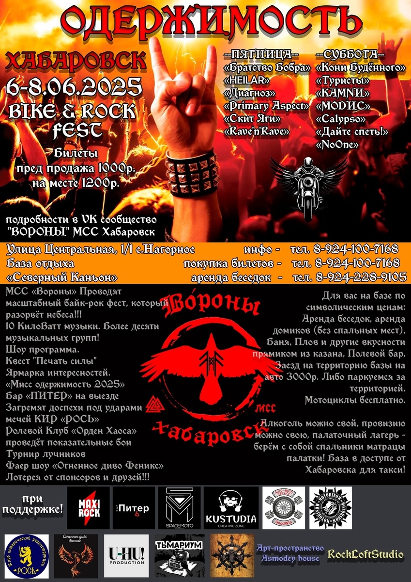 ✏️ Дальняк.рф™: Ну что, друзья, вы уже подготовились к лету? НЕТ? ДА? А вот мы готовимся! Как и обещали для друзей, фанатов музыки, байкеров, да вообще просто любителей оторваться под синим небом. Мото клуб МСС «Вороны» Хабаровска и нереально крутые музыкальные команды разорвут небеса 06-08.06.2025 Улица Центральная, 1/1 с. Нагорное База отдыха «Северный Каньон» инфо - тел. 8-924-100-7168 покупка билетов - тел. 8-924-100-7168 аренда беседок - тел. 8-924-228-9105 В программе: Самые ОДЕРЖИМЫЕ группы --ПЯТНИЦА— «Братство Бобра» «HEILAR» «Диагноз» «Primary Aspect» «Скит Яги» «Rave'n'Rave» --СУББОТА— «Кони Будённого» «Туристы» «КАМNИ» «MODИC» «Calypso» «Дайте спеть!» «NoOne» Шоу программа. Квест "Печать силы" Ярмарка интересностей. «Мисс одержимость 2025» Бар «ПИТЕР» на выезде Загремят доспехи под ударами мечей КИР «РОСЬ» Ролевой Клуб «Орден Хаоса» проведёт показательные бои Турнир лучников Фаер шоу «Огненное диво Феникс» Лотерея от спонсоров и друзей!!! (((Принимаем предложения по