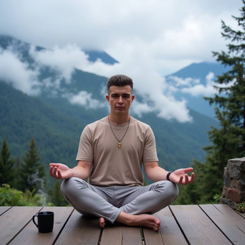 💫ПРОМТ НЕДЕЛИ Нейрофотосессия: A man meditating on a wooden porch in the mountains, wearing soft neutral tones, surrounded by fog, steaming mug beside him, peaceful mind aesthetic Мужчина медитирует на деревянной веранде в горах, одет в одежду мягких нейтральных тонов, вокруг туман, рядом чашка с паром — эстетика спокойного разума Сохраняйте и тестируйте, а ещё лучше присылайте свои результаты в комментариях👇🏻 @shvedkovpro #промтнедели