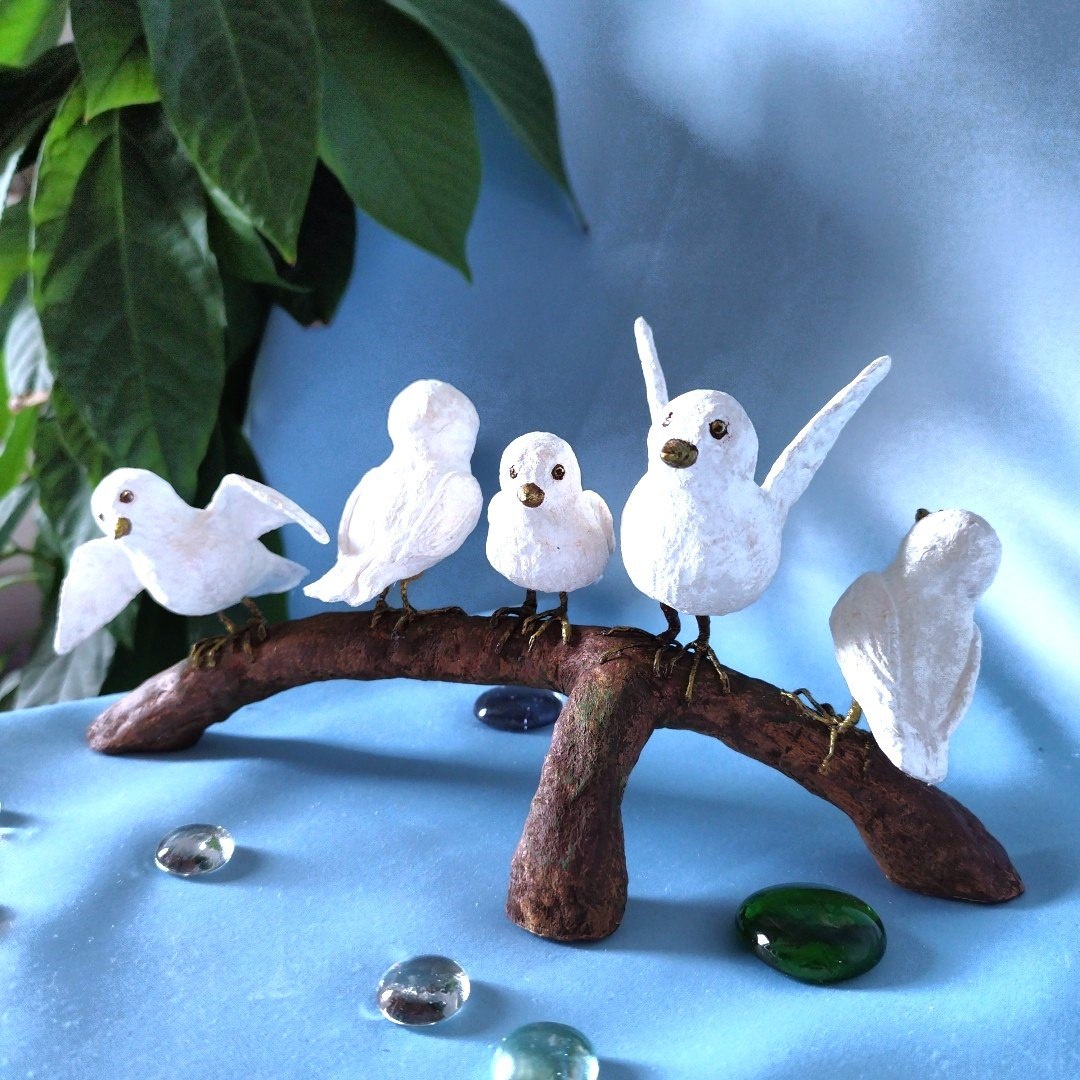 Решила всех птичек посадить на одну веточку. Сделала веточку более-менее реалистичную вроде. Композиция получилась.