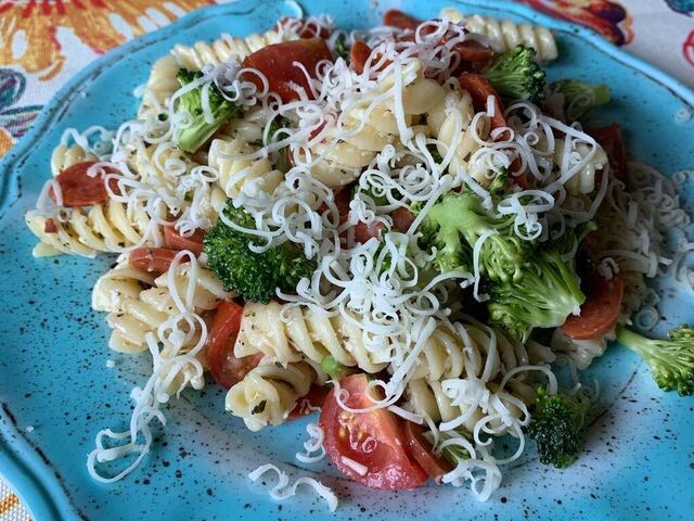 3. Добавить брокколи, пепперони и помидоры, хорошо перемешать. Посыпьте сыром моцарелла и подавайте.