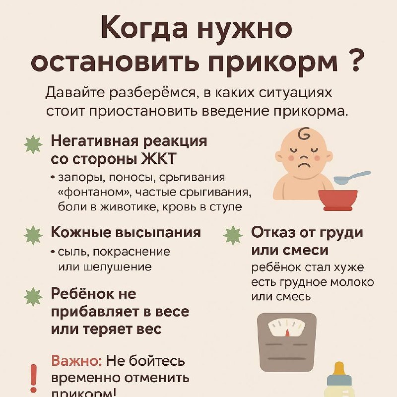 Когда нужно остановить прикорм ? ▫️▫️▫️▫️▫️▫️▫️▫️▫️▫️ Давайте разберём ситуации, когда действительно стоит приостановить введение прикорма.⤵️ ⭐Негативная реакция со стороны ЖКТ Если у ребёнка появились: 🕖запоры 🕖понос 🕖срыгивания "фонтаном" 🕖частые срыгивания 🕖боли в животике 🕖кровь в стуле ⭐Ребёнок отказывается от прикорма Малыш плачет, отворачивается, ест только при отвлечении — это говорит о том, что он пока не готов. Лучше сделать паузу. ⭐Кожные высыпания Если после введения нового продукта появилась сыпь или шелушения, стоит временно исключить этот продукт и понаблюдать за реакцией. ⭐Отказ от груди или смеси Если из-за прикорма ребёнок стал хуже есть грудное молоко или смесь — это тревожный сигнал. Помните, в первый год жизни основное питание — грудное вскармливание или смесь. Прикорм — лишь знакомство с новой пищей. ⭐Ребёнок не прибавляет в весе или теряет вес Такое состояние требует немедленной отмены прикорма и обращения к врачу! ❗️Не бойтесь отменять прикорм! К нем