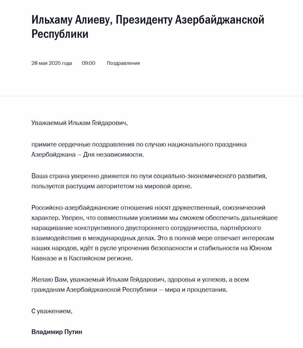 «Мира и процветания»: Владимир Путин направил Ильхаму Алиеву поздравление по случаю Дня независимости Азербайджана. «Российско-азербайджанские отношения носят дружественный, союзнический характер. Уверен, что совместными усилиями мы сможем обеспечить дальнейшее наращивание конструктивного двустороннего сотрудничества, партнерского взаимодействия в международных делах», — отметил президент РФ. ⭕ Подписаться | Прислать новость | Буст