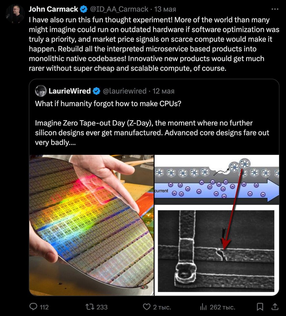 Джон Кармак (создатель оригинального Doom и хардкорный программист) высказался на тему того, что если бы люди уделяли время оптимизации, нам бы не понадобились новые мощные компьютеры, хватило бы и текущих; я думаю, в его словах есть своя правда, но сейчас все идет к более быстрому созданию кода, следуя максиме Марка Цукерберга "Move Fast and Break Things"; в эту сторону смотрит и нашумевший вайб-кодинг, и даже автоматическое создание ПО через обучение нейросети решать конкретные задачи (недавно выкладывал видео); а оптимизацию пытаются тоже свалить на машинное обучение