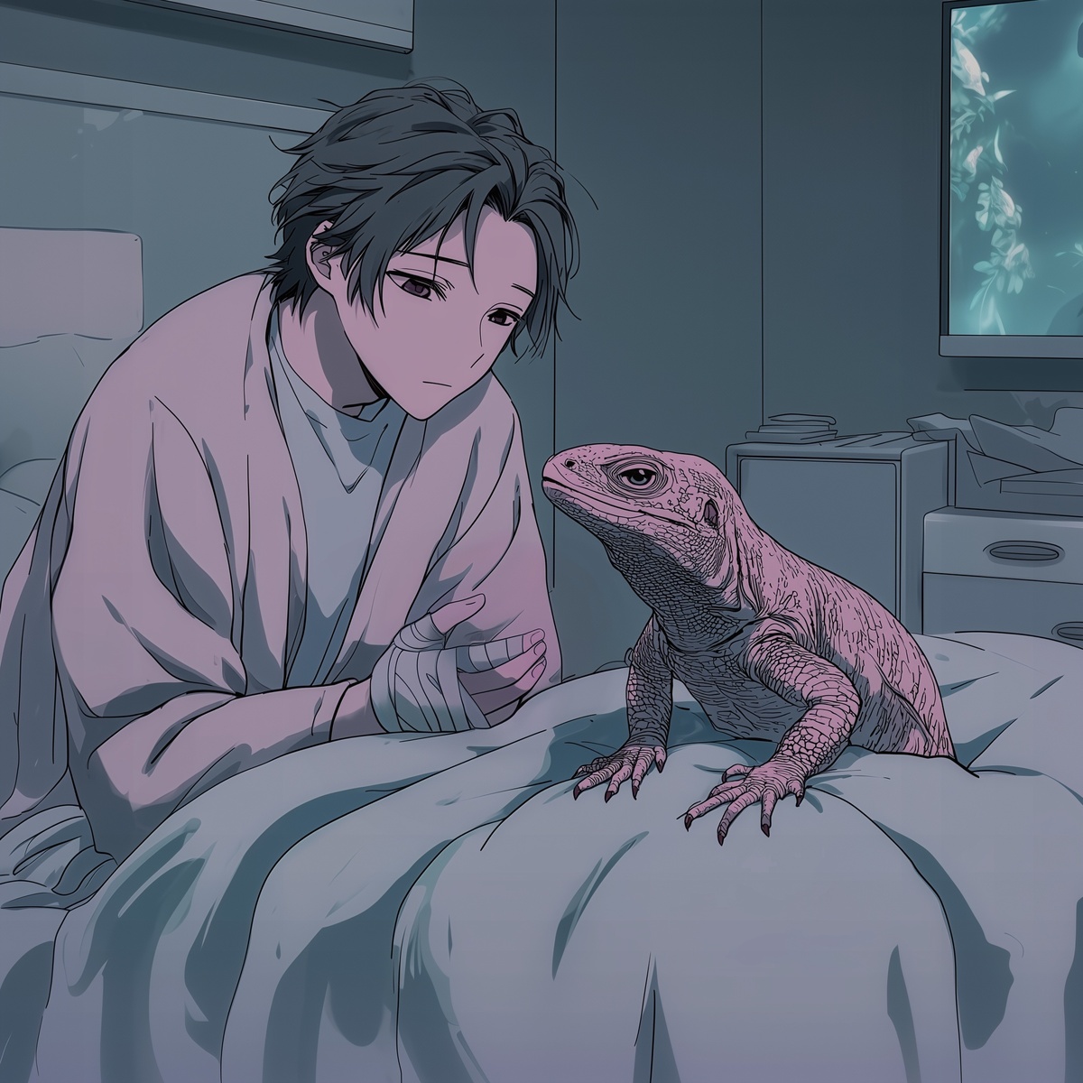 Приятелю раз подарили варана. Смотрел он за ним не особенно рьяно. Без лирики всякой снабжал его пищей: Довольно противная ведь ящерища! Заботу рептилия не оценила И как-то за палец его укусила. «Вот щас я тебя!» - он в сердцах завопил, Но грустный взгляд ящера гнев остудил. Покинув аквариум, эта зверюга Весь день неустанно таскалась за другом. Проснулся он утром - сидит ящерища В постели с слезами в огромных глазищах. Приятель проникся сочувствием этим: Вернее питомца не сыщешь на свете! Ползёт за ним, взгляда с него не спускает, А палец болит и сильней распухает. Последствий серьезных мой друг испугался, Варана схватил и к хирургу помчался. Тот справочник, брови нахмурив, раскрыл - И все про питомца ему объяснил. Варан-то его ядовитым был гадом. Они, обладая замедленным ядом, Кусают и тупо за жертвой таскаются Момента, как сдохнет она, дожидаются.