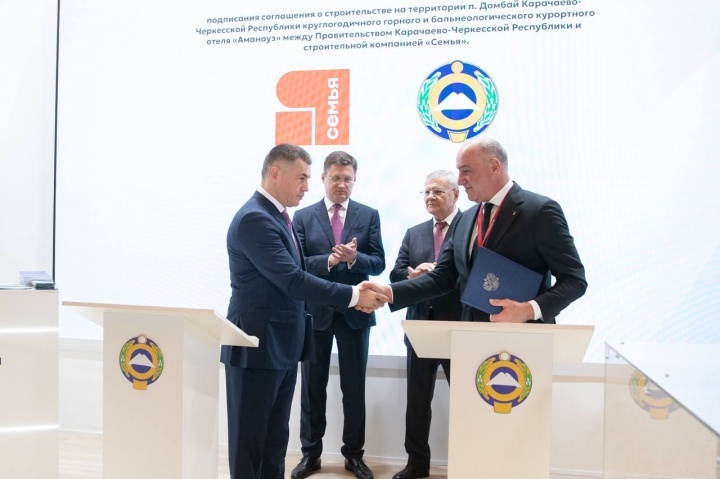 В присутствии Вице-премьера РФ Александра Валентиновича Новака и Полномочного представителя Президента России в СКФО Юрия Яковлевича Чайки на полях Кавказского инвестиционного форума Глава Карачаево-Черкесии Рашид Темрезов подписал соглашение с Генеральным директором ООО СК «Семья» Русланом Воруковым, в рамках которого в Домбае на высоте 1600 метров будет построен бальнеологический отель «Аманауз» общей площадью здания 47 тысяч кв.м с номерным фондом в 454 номера. Реализация проекта после открытия круглогодичного отеля позволит создать более 450 рабочих мест. По прогнозам, налоговые поступления в бюджет за пять лет составят не менее 1,7 млрд руб. «В Карачаево-Черкесии за последние годы наблюдается устойчивое увеличение туристического потока. Особое место в этом развитии занимает Домбай, который сейчас проходит масштабную реновацию: модернизируется транспортная и инженерная инфраструктура, улучшается сервис, обновляется облик курортной зоны. Строительство круглогодичного отеля – это оди